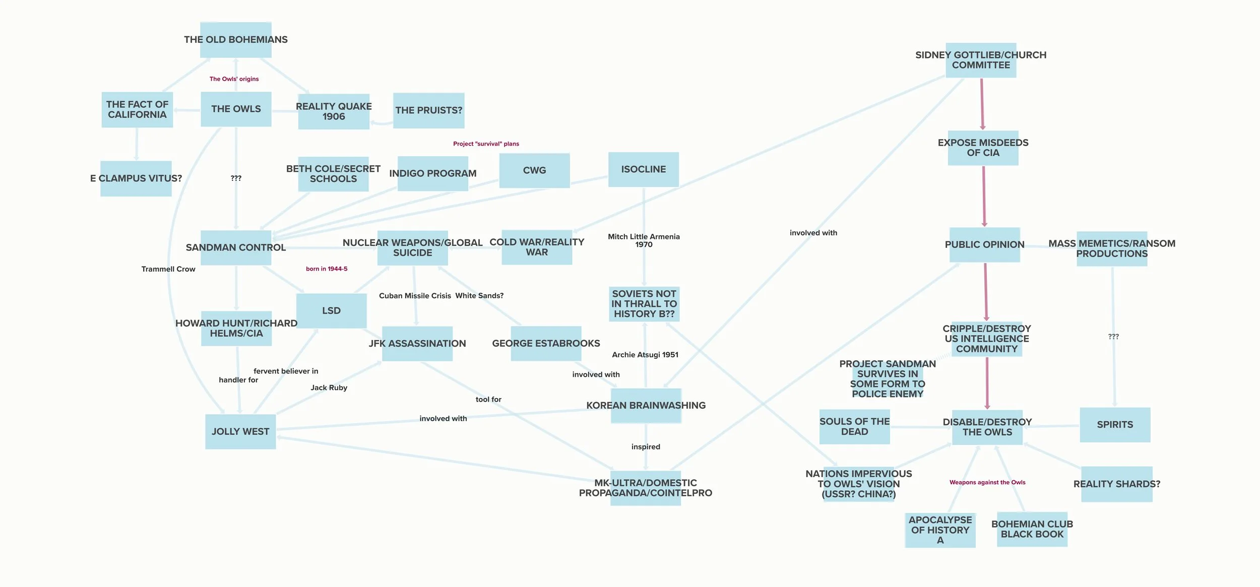 The esmological flowchart features one big remaining question: how to separate Project SANDMAN's ostensible purpose—resisting History B's oozing into History A—from The Owls and how they've historically used SANDMAN to feather their nests and assure their dominion over the West and eventual global dominion; here another arrow sprouts off back to COLD WAR/REALITY WAR.